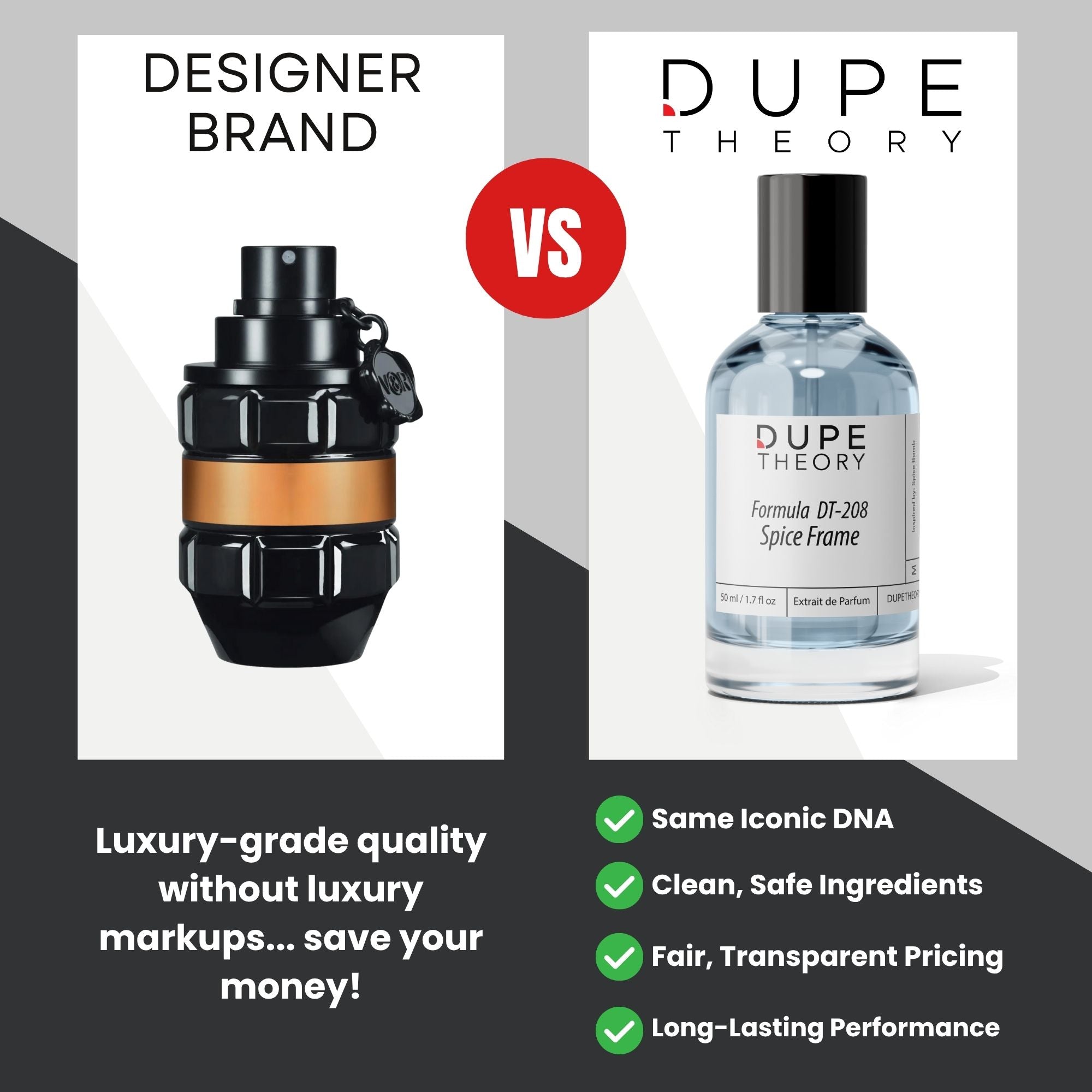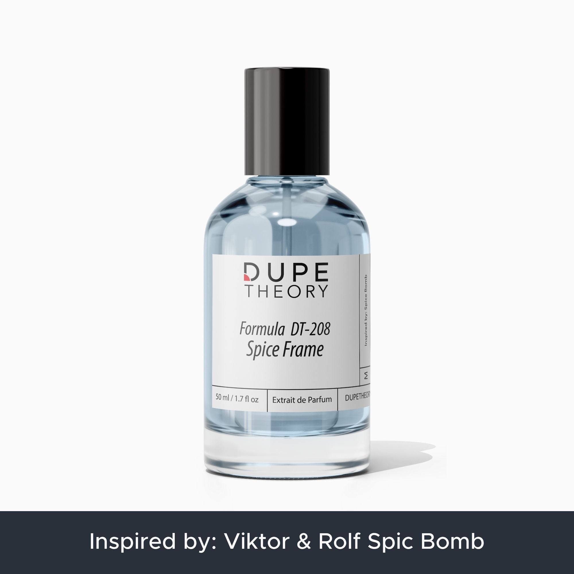 DT-208 Spice Frame is an Extrait de Parfum inspired by Spicebomb, designed for warm spicy intensity and long-lasting performance. It opens with pink pepper and citrus, transitions into cinnamon and saffron, and settles into tobacco, leather, and vetiver.